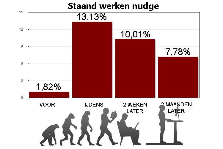 Met geweldig resultaat! Waar voorafgaand aan de nudge slechts een kleine 2% staand werkte, was dit tijdens de nudge-periode ruim 13%! Zelfs twee maanden nadat we het onderzoek hadden gedaan, en we de tafels niet meer iedere dag zelf omhoog zette, werkte nog een kleine 8% staand. Ruim vier keer zo veel!