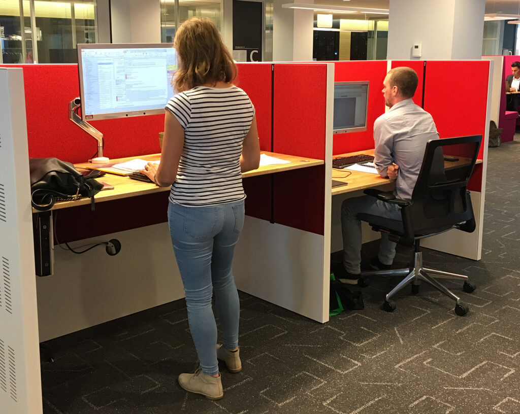 Hoog opgeleide werknemers zitten 9,5 uur per dag. Dat brengt gezondheidsrisico’s met zich mee. Afwisselend staand en zittend werken is gezonder. In ons kantoor hebben wij werkplekken waar zitten en staan met een eenvoudige druk op de knop afgewisseld kan worden. Maar dat de mogelijkheid er ís, betekent niet dat er ook automatisch gebruik van wordt gemaakt.